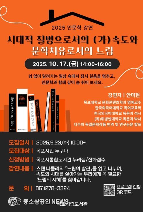 목포시립도서관은 오는 10월 17일 오후 2시, 인문학 강연 ‘시대적 질병으로서의 (가)속도와 문학치유로서의 느림’을 진행한다.