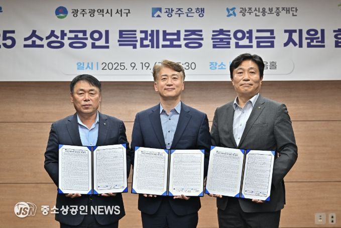 광주은행은 19일, 광주광역시 서구청에서 김이강 광주광역시 서구청장과 이상채 광주은행 부행장, 염규송 광주신용보증재단 이사장 등이 참석한 가운데, 광주광역시 서구 및 광주신용보증재단과 ‘서구 소상공인 특례보증 업무협약’을 체결했다고 밝혔다.