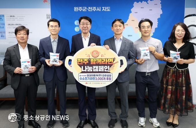 현대차동차 전주공장(공장장 장현구)은 22일 전주시장실을 찾아 전주시가 중점 추진 중인 ‘전주함께라면’ 복지사업에 힘을 보태기 위해 수소전기라면 3000개를 전달했다.