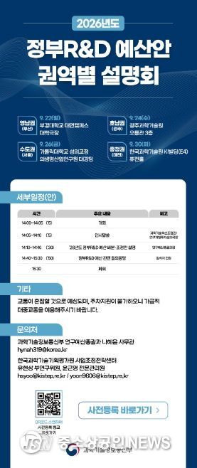 과학기술정보통신부 과학기술혁신본부는 9월 22일부터 수도권, 충청권, 호남권, 영남권 등 4개 권역에서 2026년도 국가연구개발사업 예산안 권역별 설명회를 개최한다고 밝혔다.