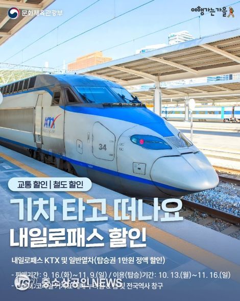 [교통할인] 철도할인 ◆ 기차타고 떠나요 내일로패스 할인 내일로패스 KTX 및 일반열차(탑승권 1만 원 정액 할인) - 판매기간: 9.16.(화)~11.9.(일) / 이용(탑승)기간: 10.13.(월)~11.16.(일) - 판매처: 코레일 기차표 예매 누리집 & 앱 및 전국역사 창구