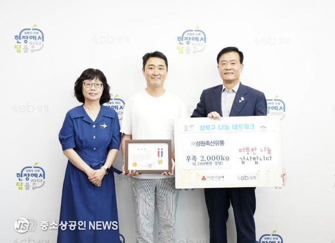 서울 성북구가 지난 16일 지역 어르신들을 위해 우족 150박스를 기부한 ㈜성원축산유통에 감사장을 수여했다. 구는 이번 기부가 단순한 후원이 아니라 현장에서의 감동이 이어진 진심 어린 나눔이었다고 밝혔다.