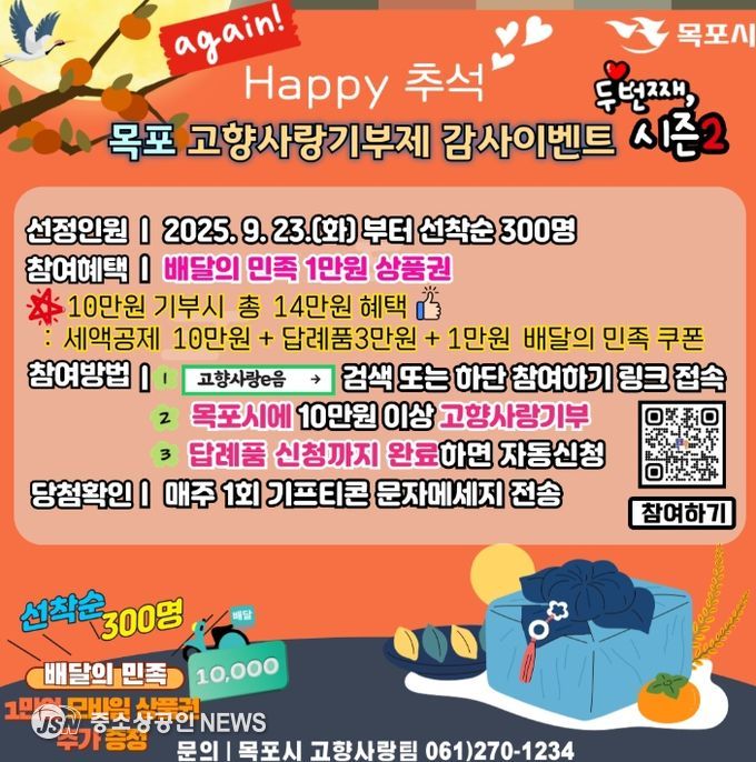 목포시는 지난 16일부터 진행한 추석 명절맞이 고향사랑기부제 참여 이벤트가 기부자들의 뜨거운 성원에 힘입어 단 3일 만에 조기 종료됨에 따라, 후속 행사인 ‘Happy 추석~ 목포 고향사랑기부제 감사이벤트 시즌2’를 추진한다고 밝혔다.