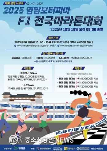 영암군이 10/9일까지 ‘영암모터피아 F1 전국 마라톤대회’ 참가자 4,000명을 선착순으로 접수받는다.