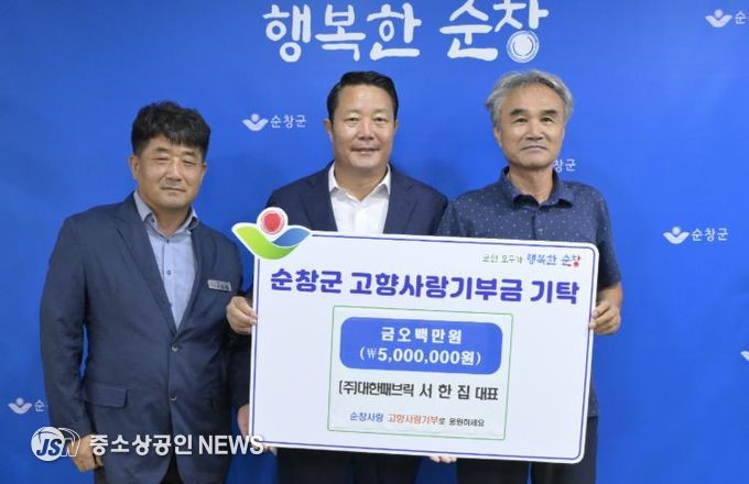 순창 출신 기업인 (주)대한패브릭 서한집 대표이사가 23일 순창군에 고향사랑기부금 500만원을 전달하며 올해로 3년째 고향사랑을 실천했다.