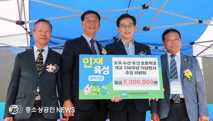 영암 도포·수산·도신초등학교 100주년 기념행사 추진위원회가 20일 (재)영암군미래교육재단에 인재육성기금 500만원을 전달했다.