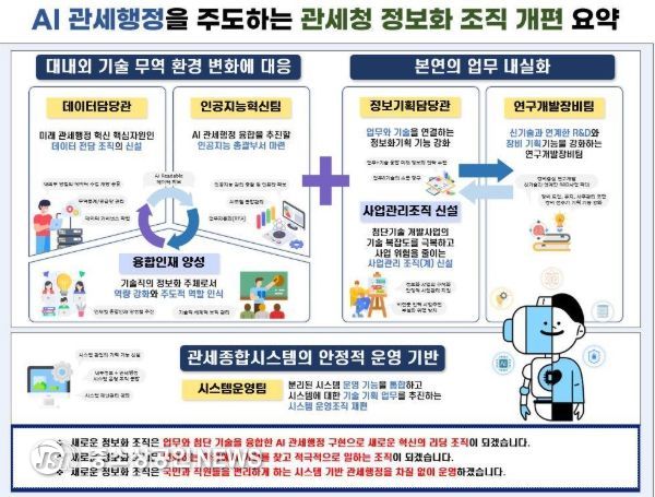 관세청은 이번 조직개편을 통해 '인공지능혁신팀'과 '데이터담당관'을 신설하는 한편, 첨단기술 사업관리, 정보화 기획 기능을 강화하여 관세행정 전반에 걸친 인공지능(AI) 융합을 본격적으로 추진한다.