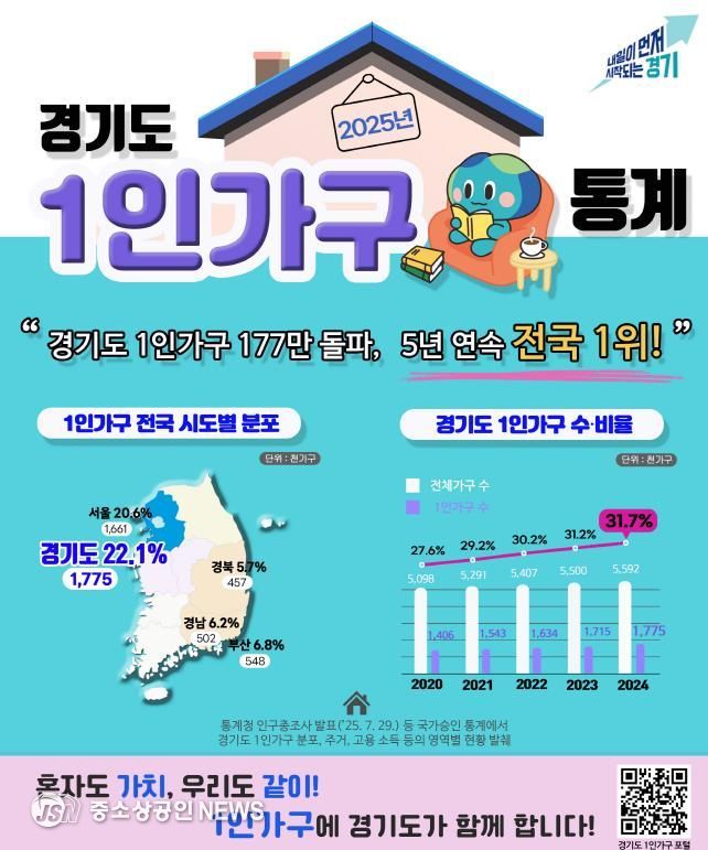 경기도는 이러한 내용을 담은 ‘2025 경기도 1인가구 통계’를 24일 발표했다.