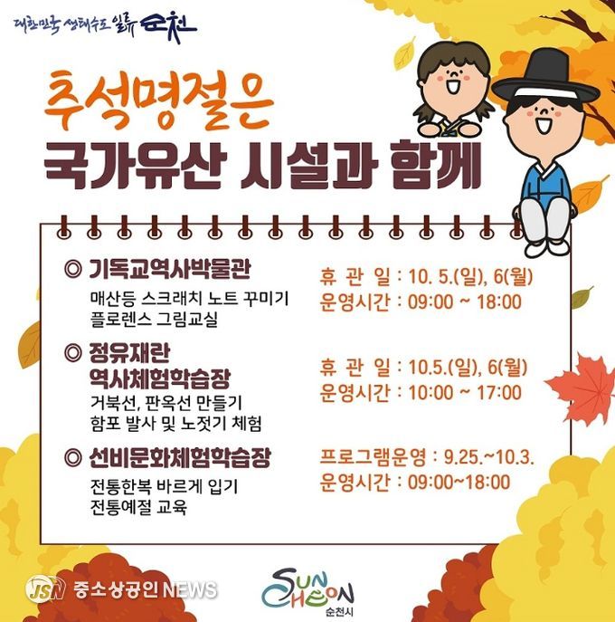 순천시는 다가오는 추석 연휴를 맞아 기독교역사박물관, 정유재란역사체험학습장, 선비문화체험학습관 등 국가유산시설에서 온 가족이 함께 즐길 수 있는 체험 프로그램을 10월 3일부터 9일까지 운영한다고 밝혔다.