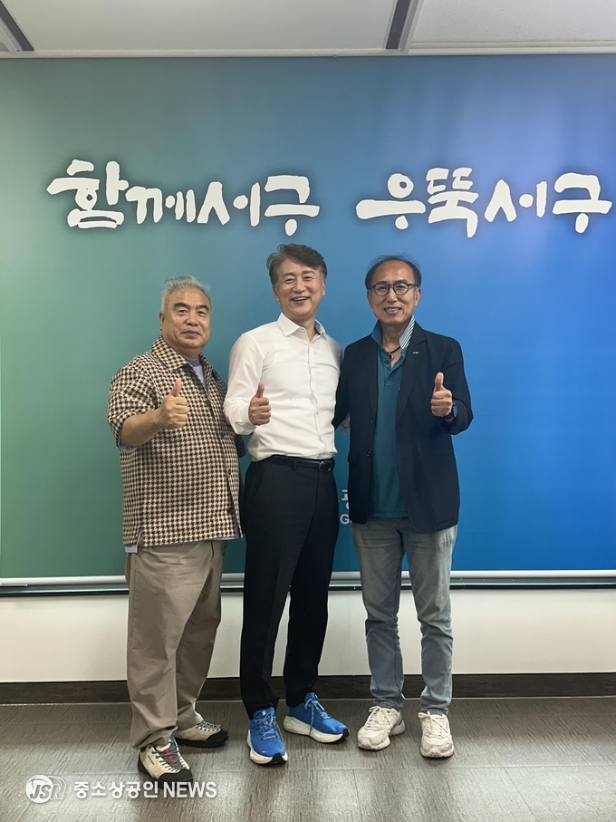 [김이강 광주 서구청장(가운데)이 2025년 9월 22일 서구청에서 열린 간담회에서 이기성 광주광역시소상공인연합회 회장(왼쪽), 장성우 광주시소상공인연합회 서구지부 회장(오른쪽)과 기념촬영을 하고 있다.] (사진=중소상공인뉴스)