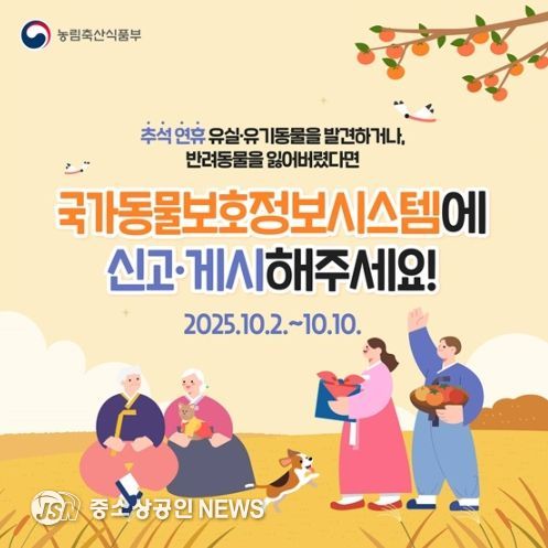 추석 연휴 유실·유기동물을 발견하거나, 반려동물을 잃어버렸다면 국가동물보호정보시스템에 신고·게시해주세요!