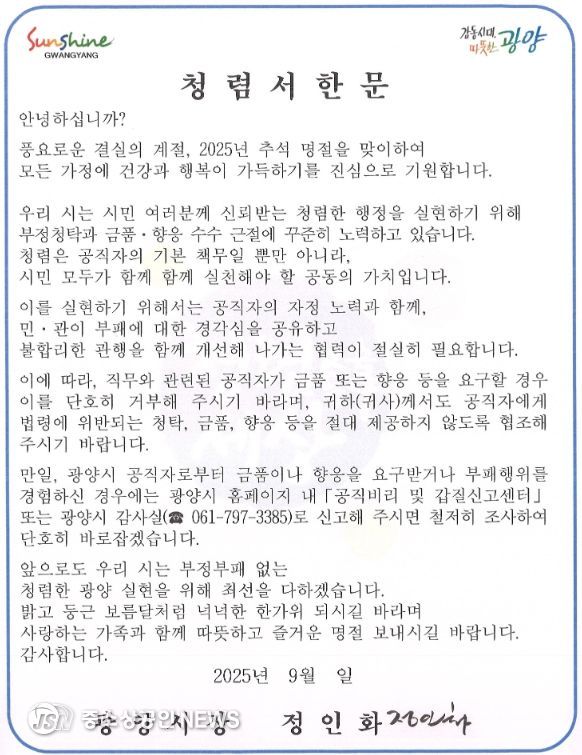 광양시가 9월 24일 추석 명절을 앞두고 외부 민원인과 내부 직원들에게 청렴서한문을 발송해 청렴한 공직문화와 건전한 명절 분위기 조성에 앞장섰다.