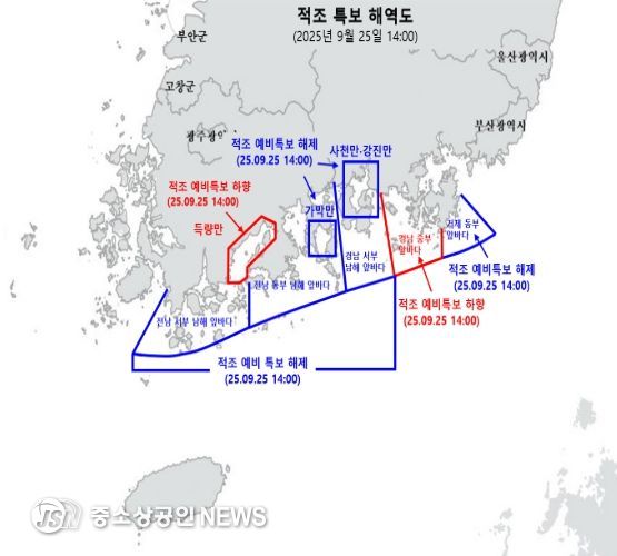 이는 국립수산과학원이 경남 중부앞바다와 득량만 2개 해역에 내려진 적조 주의보를 예비특보로 낮추고, 나머지 6개 예비특보 해역을 모두 해제한 데 따른 조치이다.