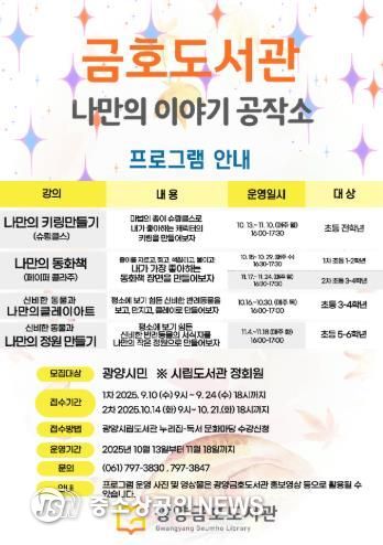 광양금호도서관은 오는 10월 13일부터 11월 18일까지 초등학생을 대상으로 책과 연계한 창작활동 프로그램 '나만의 이야기 공작소'를 운영하며, 이에 참여할 수강생을 모집한다고 밝혔다.