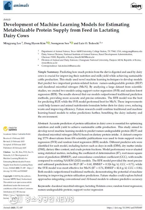 두 가지 예측 모형은 젖소에게 공급되는 핵심 단백질인 ‘반추위에서 분해되지 않고 소장에서 흡수되는 단백질(RUP)’과 ‘반추위 미생물이 사료를 분해하며 합성하는 단백질(MicN)’을 정확히 예측할 수 있도록 설계됐다.