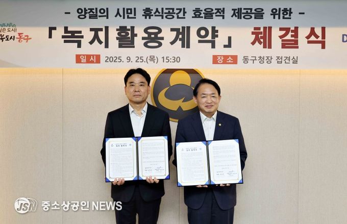 인천 동구는 지난 25일 동원로엑스㈜(인천㈜ 대표이사 최안석)와‘녹지활용계약’을 체결했다고 밝혔다. 인천 최초로 진행된 이번 계약은 민간기업이 소유한 사유지를 주민에게 열린 녹지로 제공하는 새로운 방식의 민관 협력 모델이다.