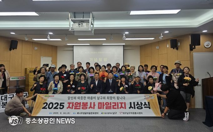 대구 남구는 대구 남구자원봉사센터(센터장 이창지)와 함께 지난 9월 24일, '2025 자원봉사 마일리지 시상식'을 열고 한 해와 오랜 세월 동안 지역사회를 위해 헌신해 온 우수 자원봉사자들에게 인증메달, 공로패, 핸드프린팅을 수여했다.