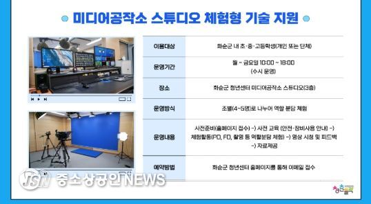 화순군은 청소년들의 창의적 활동을 지원하고 진로 탐색의 기회를 제공하기 위해 화순군 청년센터 미디어공작소 스튜디오를 무료로 개방, 체험형 기술 지원 프로그램을 운영하고 있다고 26일 밝혔다.