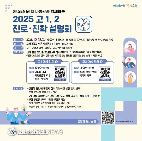 「2025 고 1, 2 진로·진학 설명회」는 10월 18일, 고려대학교 인촌기념관 강당에서 고 1, 2 학생·학부모·교사를 대상으로 개최된다. 오전 강의(10:00~11:30)는 고1 대상'2028 대입 개편(안)에 따른 진로·진학설계', 오후 강의(13:00~14:40)는 고2 대상'2027 대입전형의 이해와 대비'로 구분해 진행된다. 각 강의는 주제별 전문성을 갖춘 서울 대학진학지도지원단 소속 교사가 맡아, 대입 변화에 따른 공신력 있는 진로·진학 정보를 제공한다.