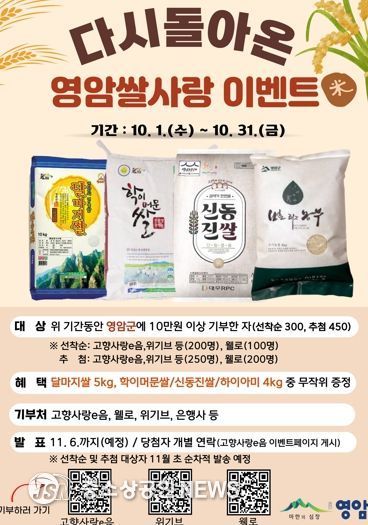 이영주 영암군 홍보전략실장은 “이번 이벤트를 통해 기부자분들께 영암 대표 쌀을 선물로 드리고, 동시에 지역 농가에도 활력을 불어 넣겠다”고 밝혔다.