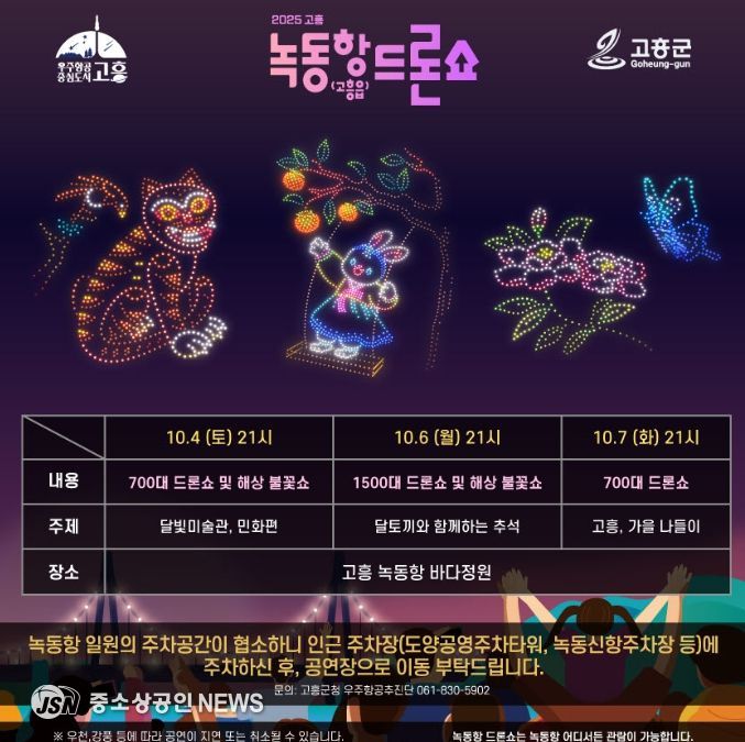 고흥군 녹동항 드론쇼는 오는 10월 25일 폐막식을 앞두고 있으며 강우, 강풍 등 기상 여건에 따라 일정이 변경될 수 있다.