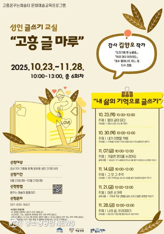 고흥군과 고흥군문화도시센터는 오는 10월부터 11월까지 '성인 글쓰기 교실: 고흥 글마루'를 운영한다고 밝혔다.