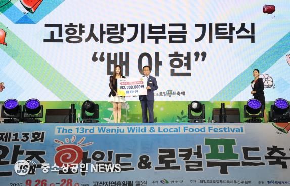 완주군 고향사랑기부제 홍보대사인 트로트 가수 배아현 씨가 지난 26일 완주 와일드&로컬푸드축제 현장에서 기탁식을 열고 200만 원을 기부하며 따뜻한 나눔을 실천했다.