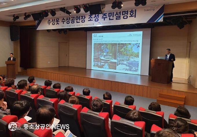 대구 수성구는 지난 29일 범어도서관 김만용·박수년홀에서 ‘수성못 수상공연장 조성 주민설명회’를 열고, 사업 추진 현황과 향후 계획 등을 주민들에게 설명하는 자리를 가졌다.