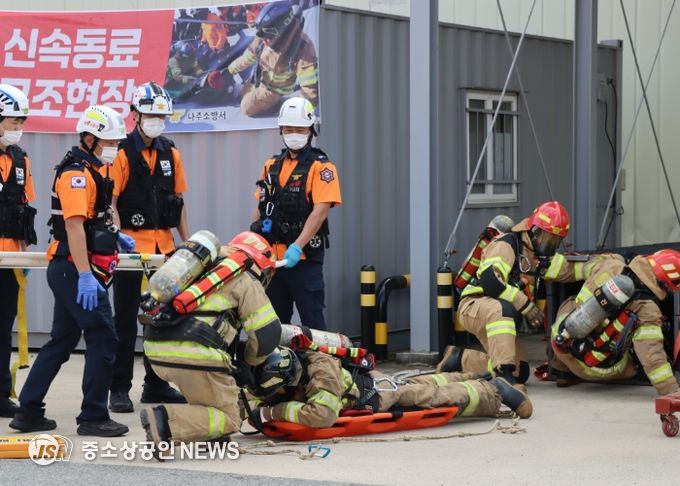 나주소방서는 29일 3M나주 공장에서 지자체, 경찰, 군부대, 관계기관 등이 참여한 가운데 긴급구조 종합훈련을 실시했다.