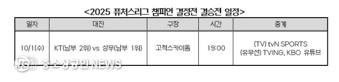 9월 29일(월) 열린 2025 퓨처스리그 챔피언 결정전 준결승전에서 남부리그 2위 KT는 북부리그 1위 한화를, 남부리그 1위 상무는 북부리그 2위 LG를 꺾고 각각 결승 진출에 성공했다.