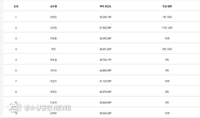 2위 김상현과 10위 김태우(27.(주)하이니스임플란트)의 포인트 격차는 22,659.96포인트다. 또한 10위 김태우와 13위 이승형(22), 17위 김범수(27)와 포인트 차는 각각 10,221.45포인트, 12,766.24포인트다. 10위 김태우와 20위 하충훈(35.㈜일신테크놀로지)와 차이는 16,500.06포인트다.
