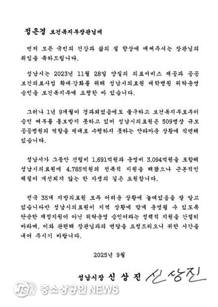 이어 “성남시의료원이 지역 상황에 맞게 운영될 수 있도록 단순한 재정지원이 아닌 위탁운영 승인이라는 정책적 지원이 반드시 필요하다”며 “이와 관련해 장관님과의 면담을 요청드린다”고 밝혔다.