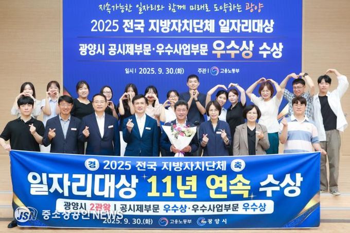 광양시는 9월 30일 청주 오스코에서 열린 고용노동부 주관 '2025년 전국 지방자치단체 일자리대상' 시상식에서 공시제 부문과 우수사업 부문 모두 우수상을 수상하며, 2015년부터 11년 연속 수상이라는 값진 성과를 거뒀다고 밝혔다.