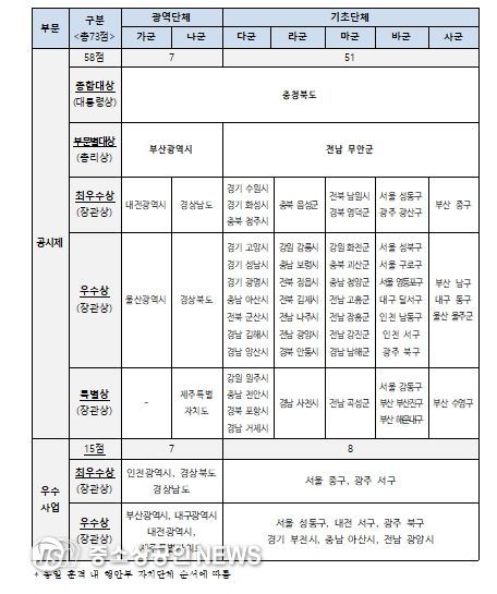 올해는 충청북도가 대통령상인 종합대상을, 부산광역시(광역자치단체 부분)와 전남 무안군(기초자치단체 부문)이 국무총리상인 부문별 대상을 받는 등 총 64개 자치단체가 수상의 영예를 안았다.