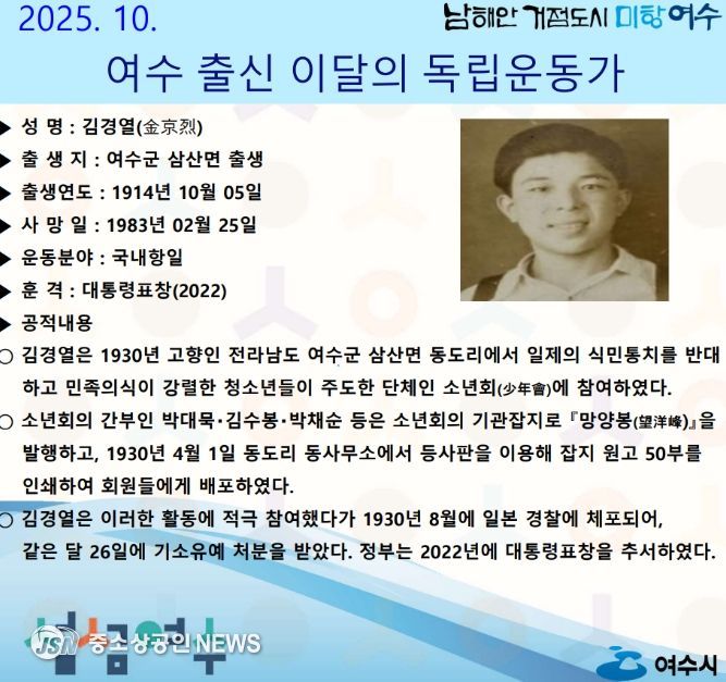 여수시는 2025년 10월의 독립운동가로 전라남도 여수군 삼산면 출신의 ‘김경열(金京烈)’ 선생을 선정했다.