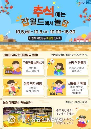 순천시는 오는 10월 5일부터 8일까지 추석 연휴를 맞아 순천만잡월드에서 '추석에는 잡월드에서 놀JOB~'이벤트를 개최한다.