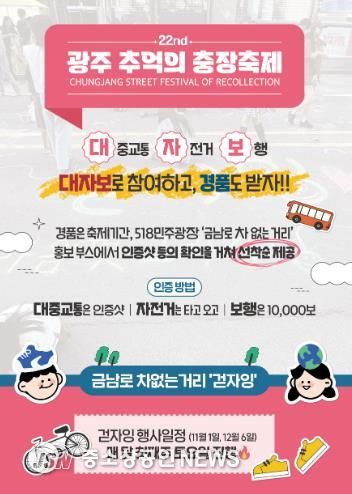 광주 동구는 오는 15일부터 5일간 금남로와 충장로 일원에서 열리는 제22회 광주 추억의 충장축제에서 ‘금남로 차 없는 거리’의 가치를 알리고 대자보 도시 정책에 시민 참여를 확대하기 위한 특별 홍보 이벤트를 진행한다고 밝혔다.