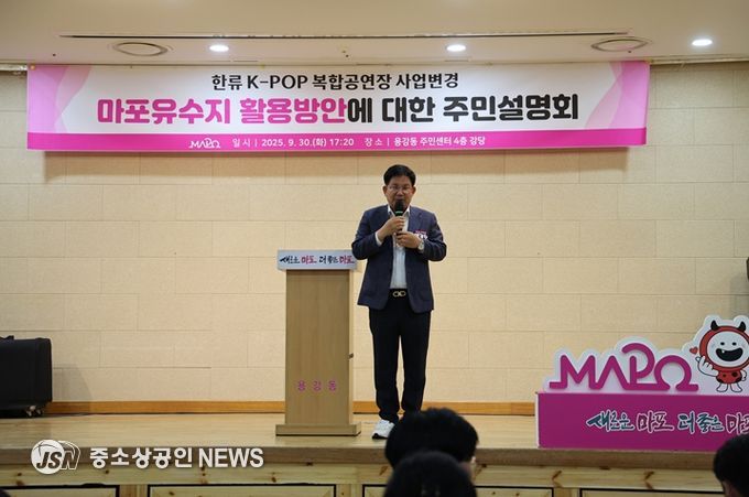 서울시 마포구는 9월 30일 오후 용강동주민센터에서 마포유수지 한류 케이팝(K-POP) 복합공연장 조성사업 변경과 관련하여 주민설명회를 개최하고, 공연장 대신 주민 생활밀착형 체육문화복합시설을 새롭게 추진하겠다고 밝혔다.