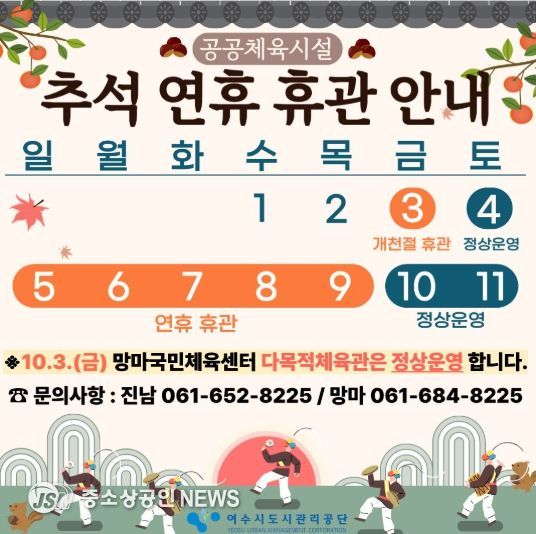 여수시도시관리공단은 대명절 추석 연휴 기간(10월 5일~10월 9일) 동안 공단이 운영 중인 공공 체육시설을 휴관한다고 밝혔다.