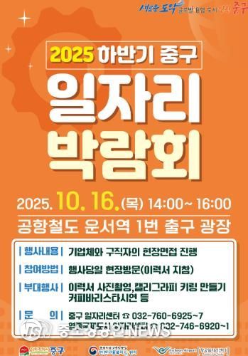 인천시 중구는 오는 16일 공항철도 운서역 1번 출구 앞 광장에서 ‘2025 하반기 중구 일자리 박람회’를 개최한다고 밝혔다.
