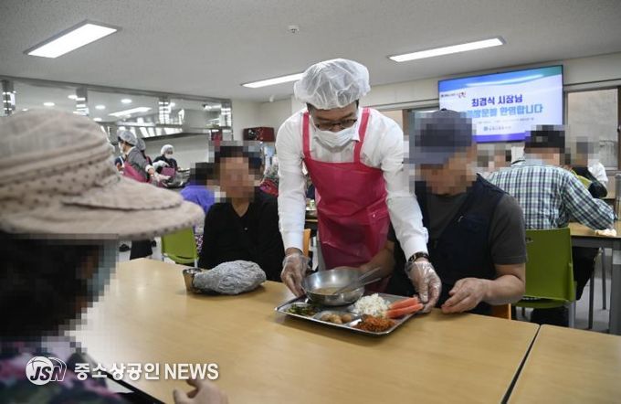 최경식 남원시장이 지난 10일 기능보강이 완료된 남원사회복지관 경로식당을 방문해 배식 봉사를 진행하며 어르신들과 소통하는 시간을 보냈다.