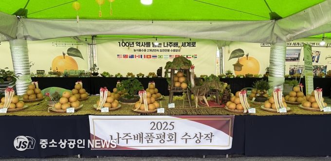 전라남도 나주시가 ‘2025 나주영산강축제’와 연계해 열리고 있는 ‘나주농업페스타’ 현장에서 나주배 품평회 수상작을 비롯한 다양한 전시와 체험 프로그램을 선보이며 시민과 관광객의 발길을 사로잡고 있다.