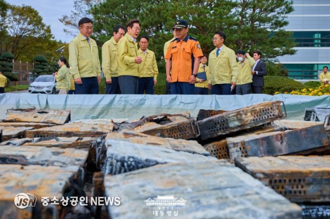 이 대통령은 먼저 화재구역 배터리를 모아 둔 냉각 침수조를 둘러본 뒤, 실제 화재가 발생한 5층 전산실을 찾아 피해 상황을 점검했다.