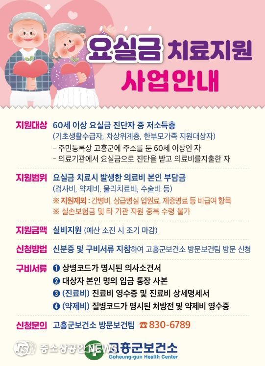 지원 대상은 고흥군에 주소를 둔 60세 이상 어르신 중 의료기관에서 요실금 진단을 받고 치료비를 지출한 ▲기초생활수급자 ▲차상위계층 ▲한부모가족 등 저소득층이다.
