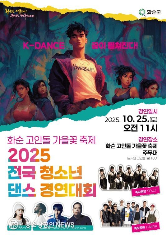 화순군은 제2회 화순군 전국 청소년 댄스경연대회 본선이 오는 10월 25일(토) '2025 화순 고인돌 가을꽃 축제 주무대에서 개최된다고 밝혔다.