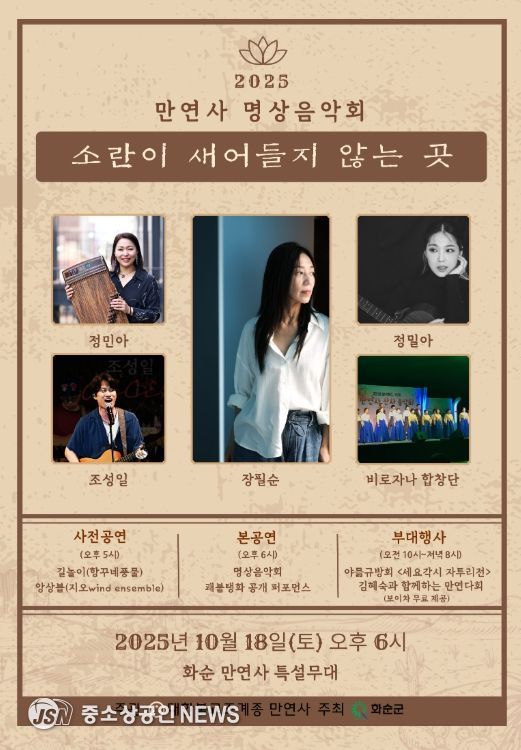 화순군은 오는 18일 저녁 6시 ‘2025 만연사 산사음악회’가 만연사 특설무대에서 개최된다고 밝혔다.