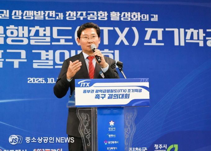 이 시장은 이날 오후 청주국제공항 여객청사에서 열린 ‘중부권 광역급행철도(JTX) 조기착공 촉구 결의대회’에서 지난 8월 국토교통부가 한국개발연구원에 의뢰한 민자적격성 조사가 신속하게 통과돼 철도 신설을 위한 착공이 조기에 이뤄져야 한다고 강조했다.