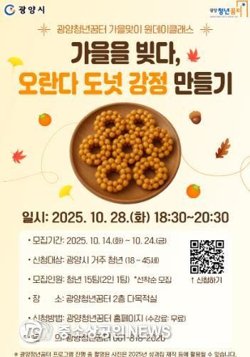 광양시는 청년들의 여가문화 활성화와 정서적 힐링을 위한 프로그램의 일환으로, 광양청년꿈터에서 가을맞이 원데이클래스 ‘가을을 빚다 – 오란다 도넛 강정 만들기’ 참가자를 모집한다고 14일 밝혔다.
