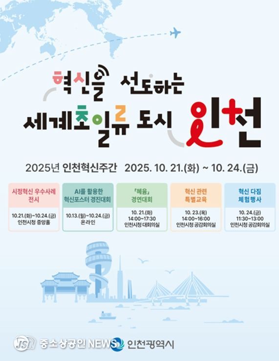 인천광역시는 혁신 행정의 성과를 확산하고 공직자의 혁신역량을 강화하기 위해 오는 10월 21일부터 24일까지 ‘2025 인천 혁신주간’을 개최한다고 밝혔다.