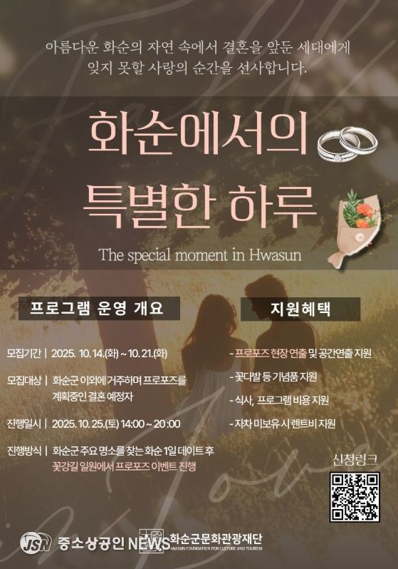 모집은 10월 14일(화)부터 10월 21일(화) 18:00까지로 화순군 외 지역에 거주하며 프로포즈를 계획 중인 커플 1팀을 모집한다. 신청은 별도의 폼 작성을 통한 온라인 접수로 가능하며, 최종선정자는 10월 22일(수) 개별 안내 예정이다.